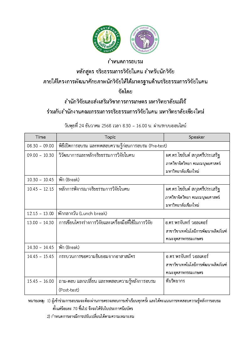 โดยสำนักวิจัยและส่งเสริมวิชาการการเกษตร มหาวิทยาลัยแม่โจ้ ร่วมกับ ชมรมจริยธรรมการวิจัยในคนในประเทศไทย (FERCIT)ผ่านระบบออนไลน์
